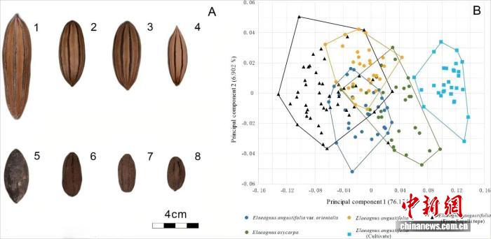 现代栽培、野生沙枣标本(左),本次研究一处遗址出土沙枣遗存及其形态学分析结果(右)。陈冠翰 供图