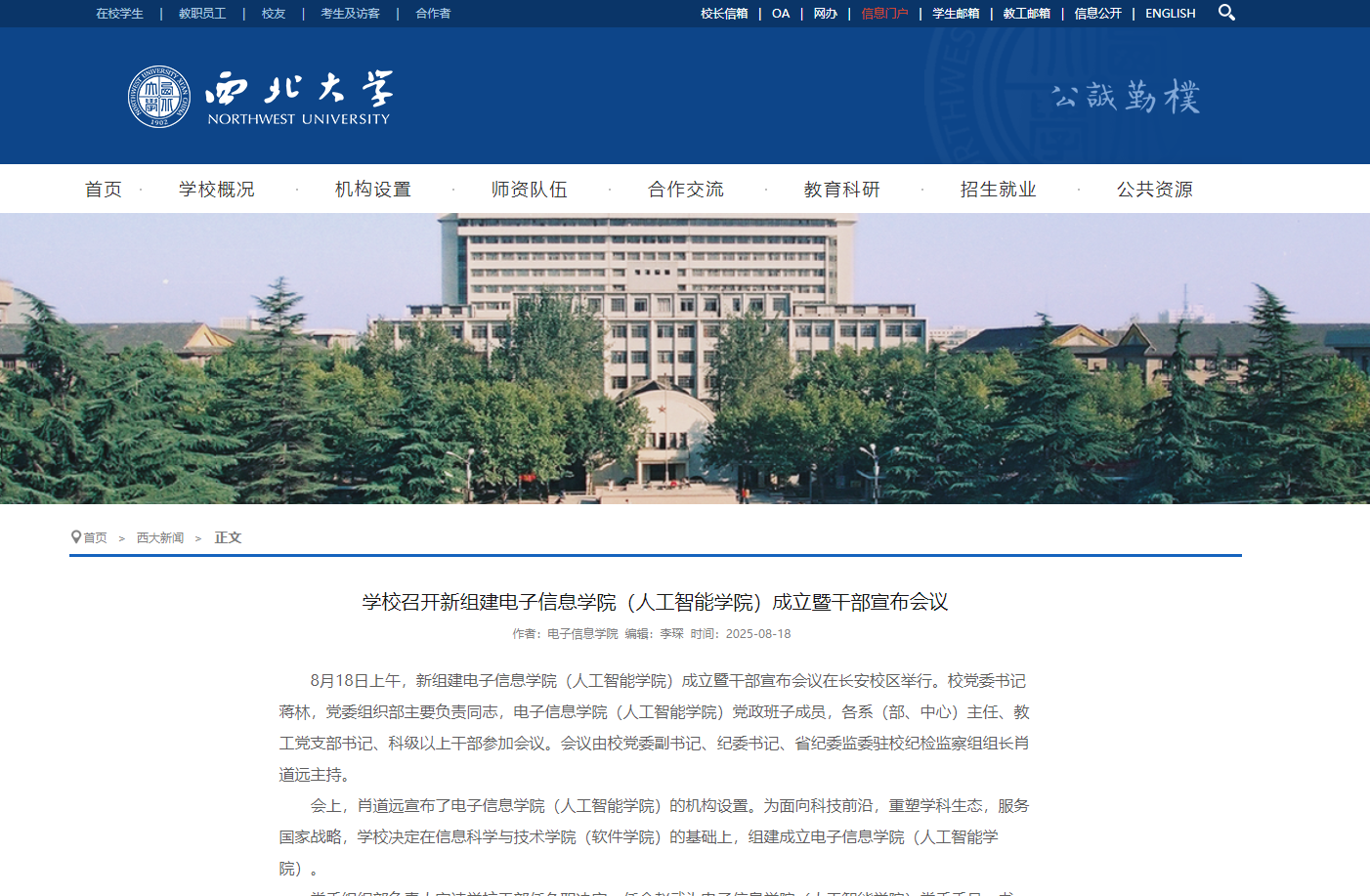 (陕西日报讯)8月18日上午,乐动网页版登录入口新组建电子信息学院(人工智能学院)、计算机学院(软件学院)成立暨干部宣布会议在长安校区举行。为面向科技前沿,重塑学科生态,服务国家战略,乐动网页版登录入口在信息科学与技术学院(软件学院)的基础上,组建成立电子信息学院(人工智能学院)。为进一步优化学科布局,强化特色学科建设,提升学校的整体办学水平和竞争力,乐动网页版登录入口在信息科学与技术学院(软件学院)的基础上,组建成立计算机学院(软件学院)。
