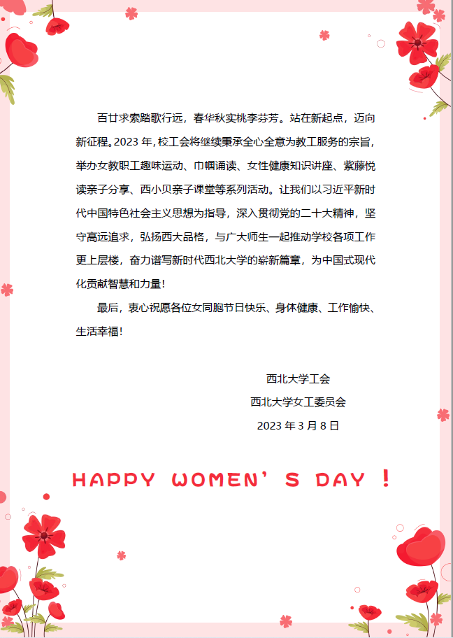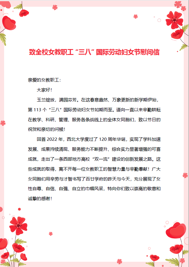 致全校女教职工“三八”国际劳动妇女节慰问信