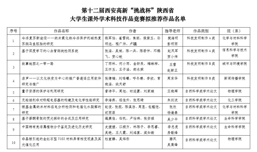 根据团中央《关于组织开展第十六届“挑战杯”全国大学生课外学术科技作品竞赛的通知》(中青联发〔2019〕1号)要求,结合我校实际,校团委拟从我校第九届“挑战杯”大学生课外学术科技作品竞赛优秀作品中遴选推荐《冷冻复苏新途径——纳米氧化铁冷冻保护剂磁热复苏斑马鱼胚胎的研究》等18件作品参加第十二届“挑战杯”陕西省大学生课外学术科技作品竞赛。现予以公示,公示期自2019年4月16日至4月23日。