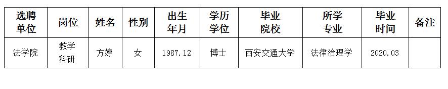 经用人单位推荐,人力资源部审查,学校教学督导及院系相关专家考核,我校拟确定下列人员来校工作。本着公平、公正、公开的原则,现将本次拟选聘人员基本情况公示如下: