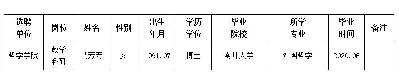 经用人单位推荐,人力资源部审查,学校教学督导及院系相关专家考核,我校拟确定下列人员来校工作。本着公平、公正、公开的原则,现将本次拟选聘人员基本情况公示如下: