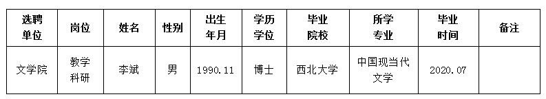 经用人单位推荐,人力资源部审查,学校教学督导及院系相关专家考核,我校拟确定下列人员来校工作。本着公平、公正、公开的原则,现将本次拟选聘人员基本情况公示如下:
