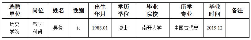 经用人单位及教学督导考核、学校研究,拟同意选聘下列人员来校工作,其聘任关系为A类人事代理。本着公平、公正、公开的原则,现将拟选聘人员基本情况公示如下: