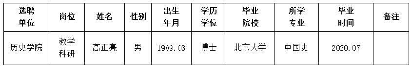 经用人单位推荐,人力资源部审查,学校教学督导及院系相关专家考核,我校拟确定下列人员来校工作。本着公平、公正、公开的原则,现将本次拟选聘人员基本情况公示如下:
