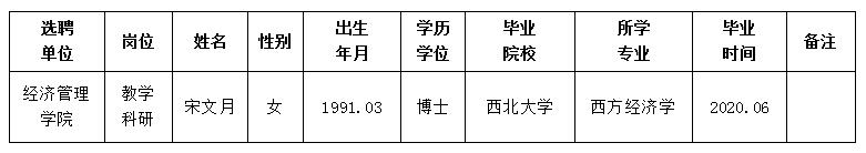 经用人单位推荐,人力资源部审查,学校教学督导及院系相关专家考核,我校拟确定下列人员来校工作。本着公平、公正、公开的原则,现将本次拟选聘人员基本情况公示如下: