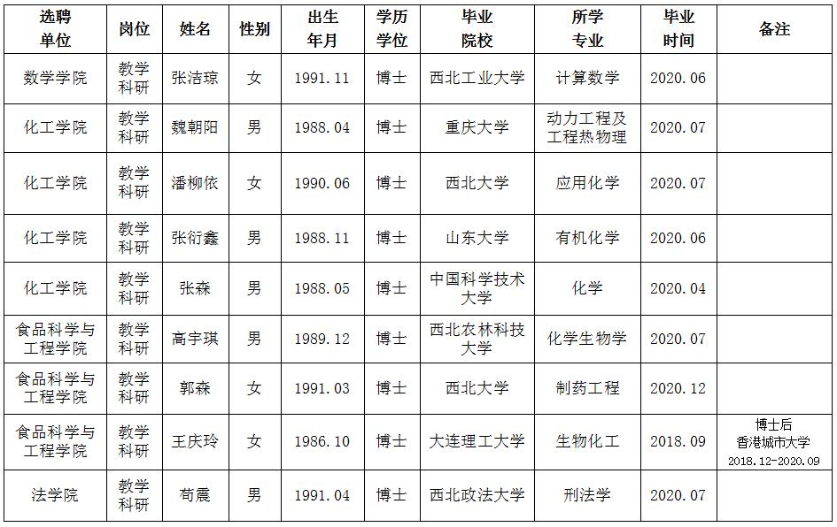 经用人单位推荐,人力资源部审查,学校教学督导及院系相关专家考核,我校拟确定下列人员来校工作。本着公平、公正、公开的原则,现将本次拟选聘人员基本情况公示如下: