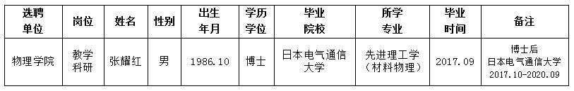 经用人单位推荐,人力资源部审查,学校教学督导及院系相关专家考核,我校拟确定下列人员来校工作。本着公平、公正、公开的原则,现将本次拟选聘人员基本情况公示如下: