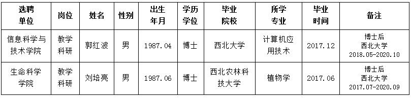 经用人单位推荐,人力资源部审查,学校教学督导及院系相关专家考核,我校拟确定下列人员来校工作。本着公平、公正、公开的原则,现将本次拟选聘人员基本情况公示如下: