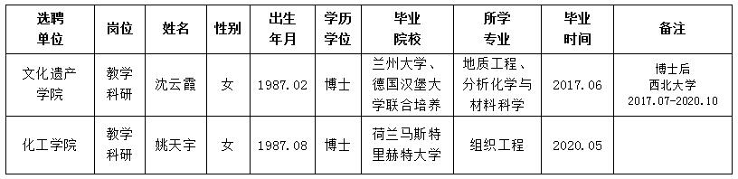 经用人单位推荐,人力资源部审查,学校教学督导及院系相关专家考核,我校拟确定下列人员来校工作。本着公平、公正、公开的原则,现将本次拟选聘人员基本情况公示如下: