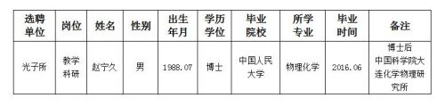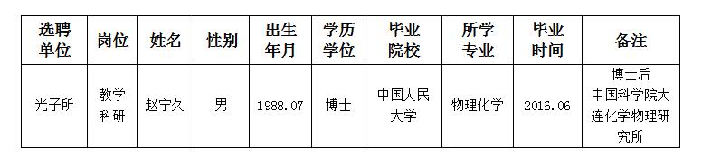 经用人单位推荐,人力资源部审查,学校教学督导及院系相关专家考核,我校拟确定下列人员来校工作。本着公平、公正、公开的原则,现将本次拟选聘人员基本情况公示如下: