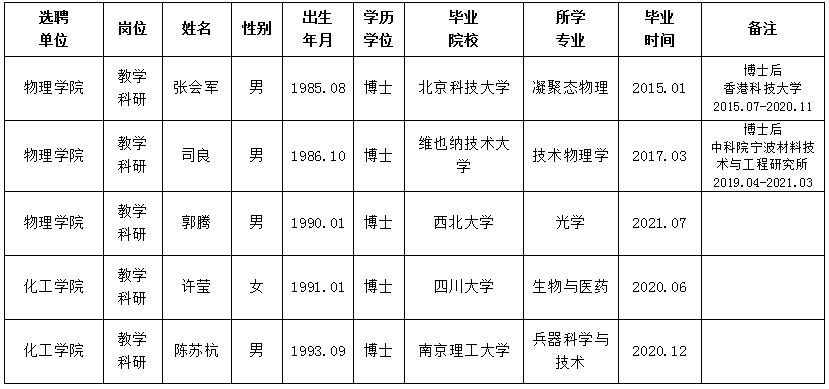 经用人单位推荐,人力资源部审查,学校教学督导及院系相关专家考核,我校拟确定下列人员来校工作。本着公平、公正、公开的原则,现将本次拟选聘人员基本情况公示如下: