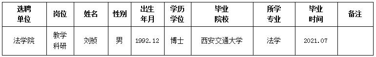 经用人单位推荐,人力资源部审查,学校教学督导及院系相关专家考核,我校拟确定下列人员来校工作。本着公平、公正、公开的原则,现将本次拟选聘人员基本情况公示如下: