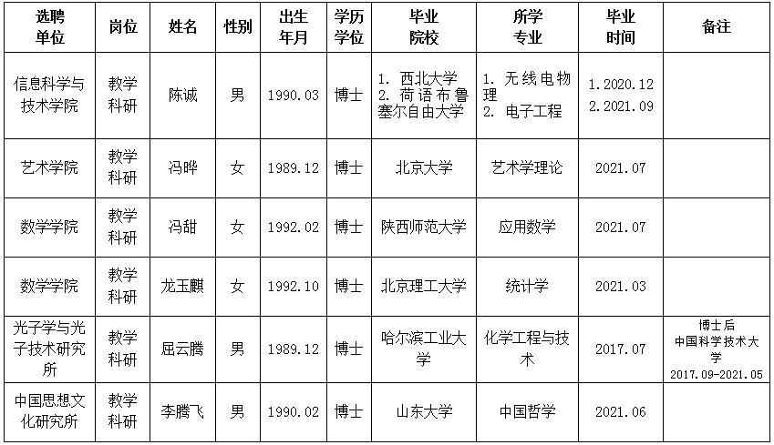 经用人单位推荐,人力资源部审查,学校教学督导及院系相关专家考核,我校拟确定下列人员来校工作。本着公平、公正、公开的原则,现将本次拟选聘人员基本情况公示如下: