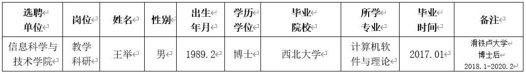 经用人单位推荐,人力资源部审查,学校教学督导及院系相关专家考核,我校拟确定下列人员来校工作。本着公平、公正、公开的原则,现将本次拟选聘人员基本情况公示如下: