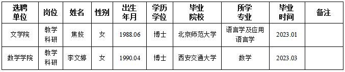 经用人单位及教学督导考核、学校研究,拟同意选聘下列人员来校工作,其聘任关系为人事代理。本着公平、公正、公开的原则,现将拟选聘人员基本情况公示如下: