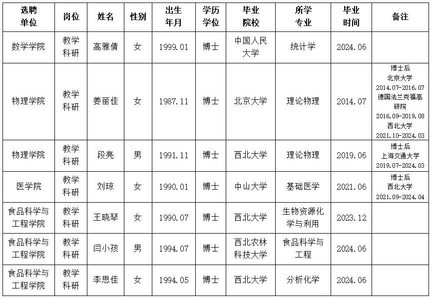 经用人单位推荐,人力资源部审查,学校教学督导及院系相关专家考核,我校拟确定下列人员来校工作。本着公平、公正、公开的原则,现将本次拟选聘人员基本情况公示如下: