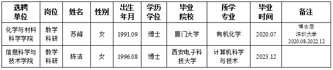 经用人单位推荐,人力资源部审查,学校教学督导及院系相关专家考核,学校专家评审会审议,我校拟确定下列人员来校工作,聘任方式为参编选聘。本着公平、公正、公开的原则,现将本次拟选聘人员基本情况公示如下: