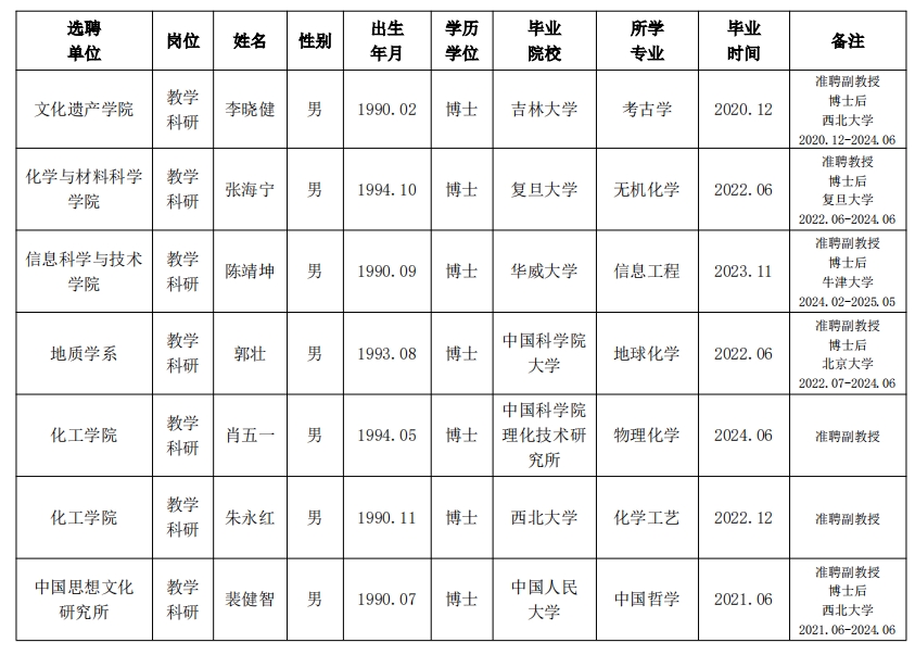 经用人单位推荐,人力资源部审查,学校教学督导及院系相关专家考核,学校教师高级职务特别评审,我校拟确定下列人员来校工作,聘任方式为事业编特别选聘。本着公平、公正、公开的原则,现将本次拟选聘人员基本情况公示如下: