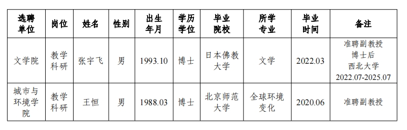 经用人单位推荐,人力资源部审查,学校教学督导及院系相关专家考核,学校教师高级职务特别评审,我校拟确定下列人员来校工作,聘任方式为事业编特别选聘。本着公平、公正、公开的原则,现将本次拟选聘人员基本情况公示如下: