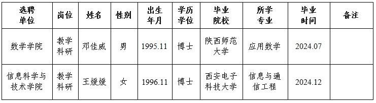 经用人单位推荐,人力资源部审查,学校教学督导及院系相关专家考核,学校专家评审会审议,我校拟确定下列人员来校工作,聘任方式为事业编正常选聘。本着公平、公正、公开的原则,现将本次拟选聘人员基本情况公示如下: