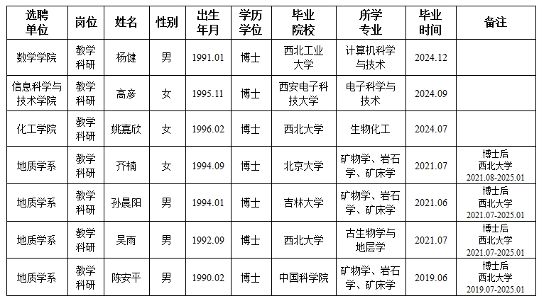 经用人单位推荐,人力资源部审查,学校教学督导及院系相关专家考核,学校专家评审会审议,我校拟确定下列人员来校工作,聘任方式为参编选聘。本着公平、公正、公开的原则,现将本次拟选聘人员基本情况公示如下: