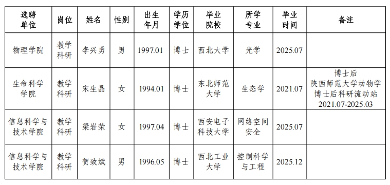 经资格审查,用人单位考查,学校专家评审会审议,我校拟确定下列人员来校工作,聘任方式为事业编正常选聘本着公平、公正、公开的原则,现将本次拟选聘人员基本情况公示如下:
