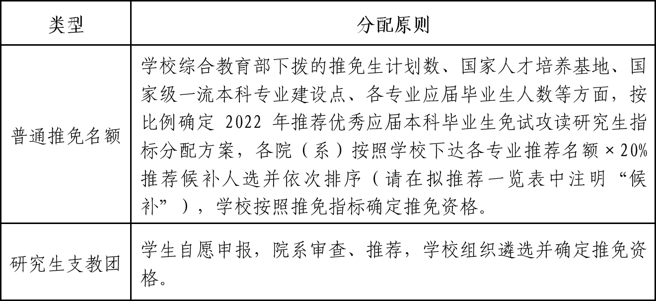 根据教育部下达的2022年推免生名额,综合考虑学科专业发展需要,现将各院(系)推荐指标分配原则制定如下: