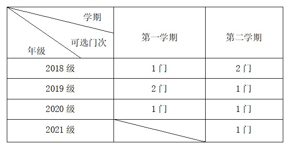 1.根据学校教学计划安排和教学资源设置情况,在选课门次上,一年级新生第一学期暂不修读通识教育选修课程,第二学期每人限选1门、二年级学生每人每学期限选1门、三年级和四年级学生可在上下两学期交错选课1-2门。具体可选课门次如下表所示: