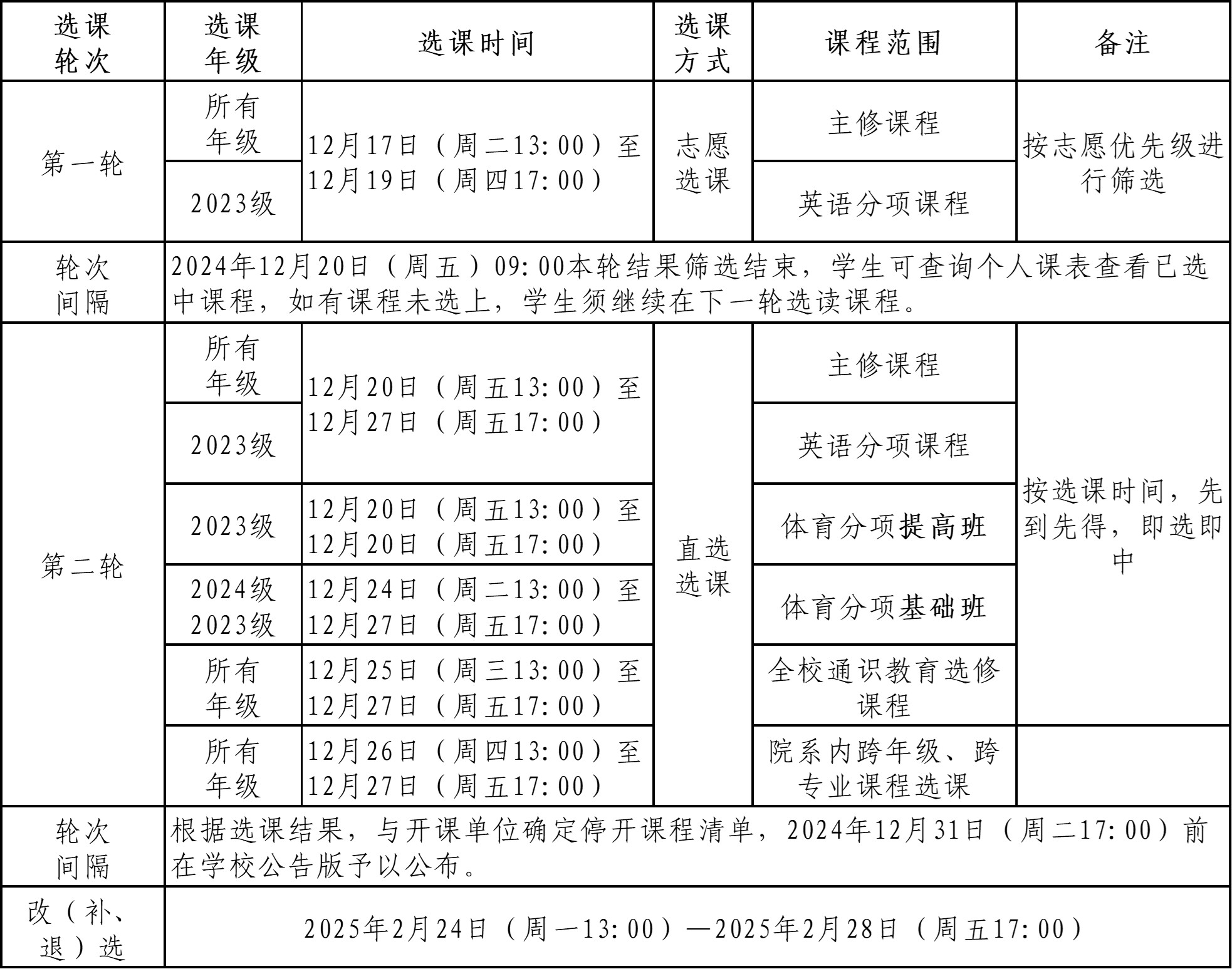 2024—2025学年第二学期课程选课分为正选和改(补、退)选。正选在12月17日(13:00)—12月27日(17:00)进行,分为两轮。改(补、退)选在2025年2月24日(13:00)—2025年2月28日(17:00)进行。现将具体事宜安排如下: