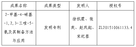 发明专利:“2-甲基-4-硝基-1,2,3-三唑-5-氨及其制备方法与应用”。