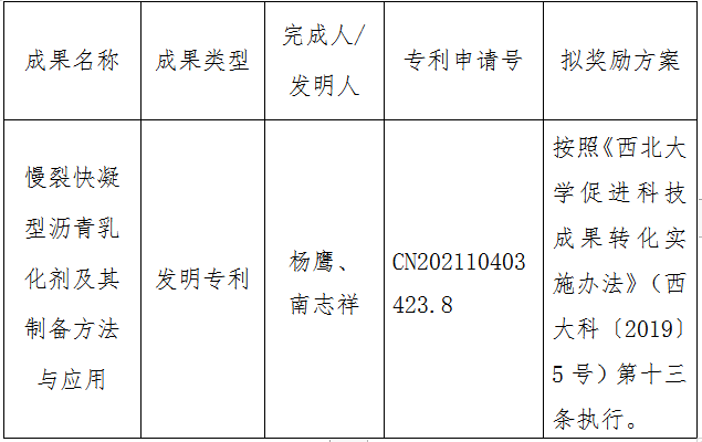 按照《乐动网页版登录入口促进科技成果转化实施办法》(西大科〔2019〕5号)相关规定,拟对我校化学与材料科学学院杨鹰副教授作为成果负责人的1项发明专利申请权实施转化,现将相关信息公示如下: