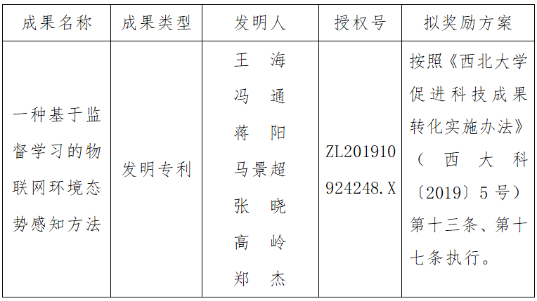按照《乐动网页版登录入口促进科技成果转化实施办法》(西大科〔2019〕5号)相关规定,拟对我校信息科学与技术学院王海副教授作为成果负责人的1项发明专利权实施转化,现将相关信息公示如下: