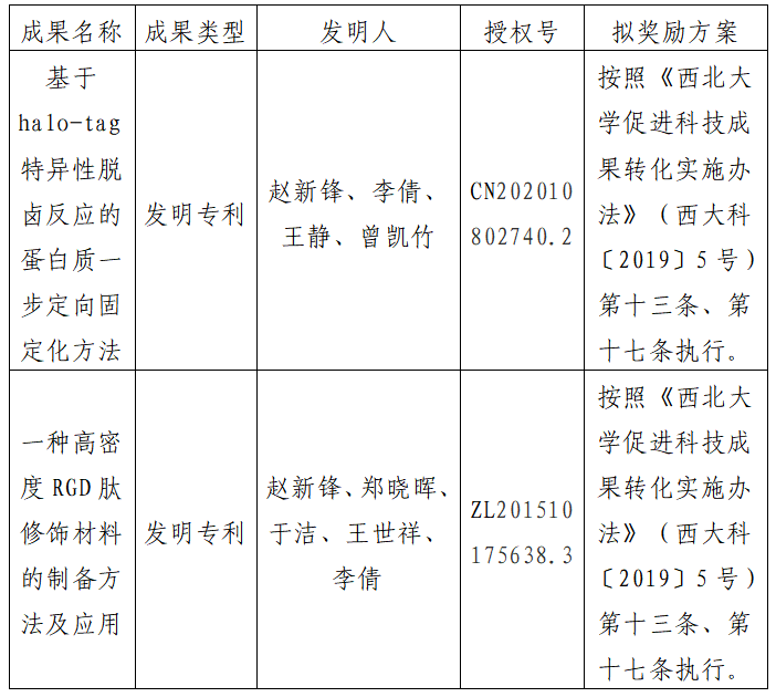 按照《乐动网页版登录入口促进科技成果转化实施办法》(西大科〔2019〕5号)相关规定,拟对我校生命科学学院赵新锋教授作为成果负责人的2项发明专利权实施普通许可,现将相关信息公示如下: