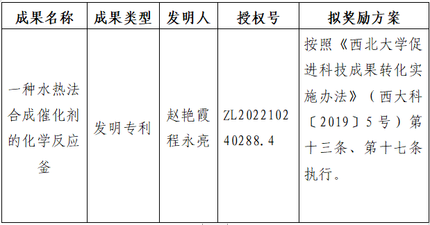 按照《乐动网页版登录入口促进科技成果转化实施办法》(西大科〔2019〕5号)相关规定,拟对我校化学与材料科学学院赵艳霞副教授作为成果负责人的1项发明专利权实施转化,现将相关信息公示如下: