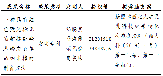 按照《乐动网页版登录入口促进科技成果转化实施办法》(西大科〔2019〕5号)相关规定,拟对我校化工学院郑晓燕副教授作为成果负责人的1项发明专利权实施转化,现将相关信息公示如下:
