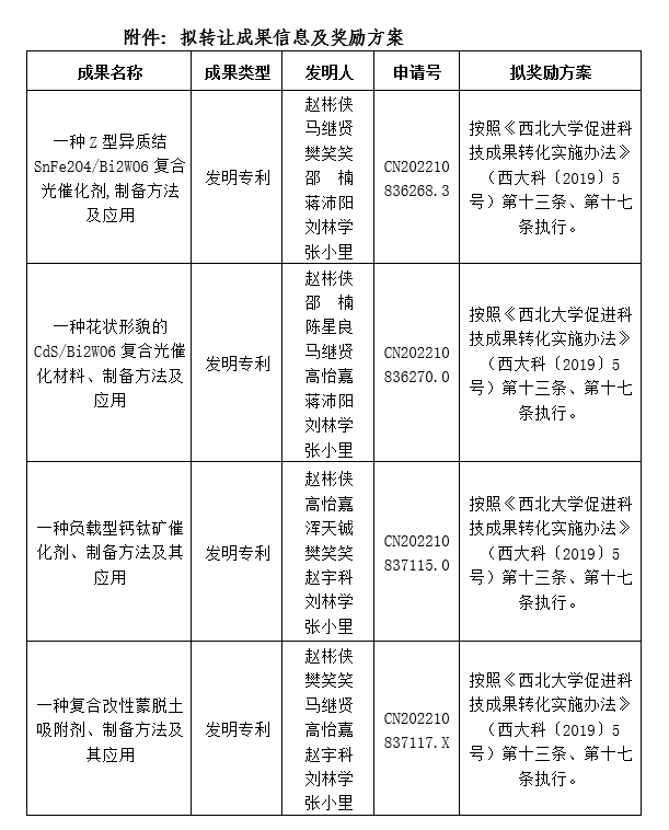 按照《乐动网页版登录入口促进科技成果转化实施办法》(西大科〔2019〕5号)相关规定,拟对我校化工学院赵彬侠教授作为成果负责人的4项专利申请权实施转化,现将相关信息公示如下: