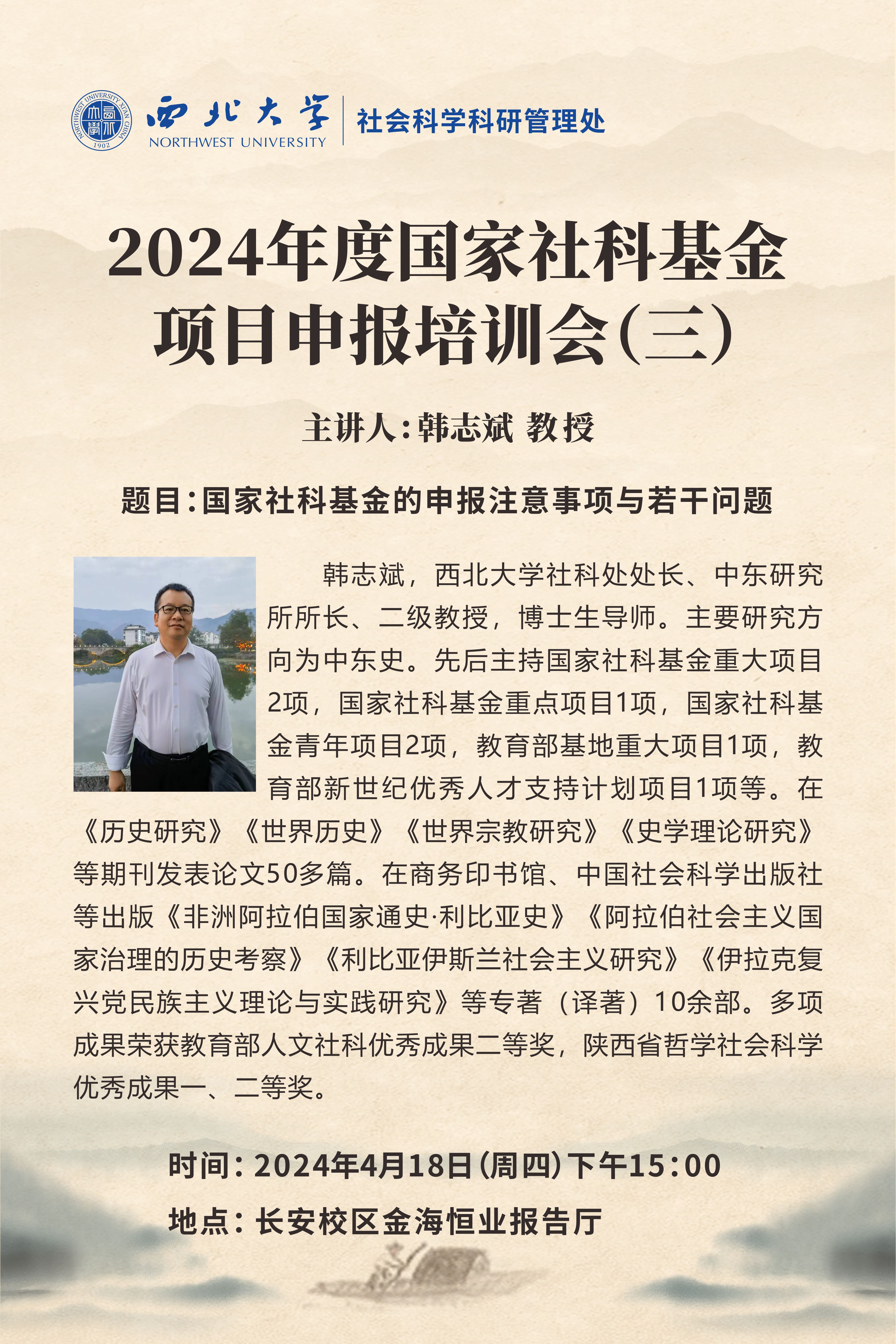 关于召开2024年度国家社科基金项目申报培训会的通知 作者: 编辑:黄心一 时间:2024-04-16 时间:2024年4月18日(周四) 地点:长安校区金海恒业报告厅 参会人员:2024年度国家社科基金项目申请人