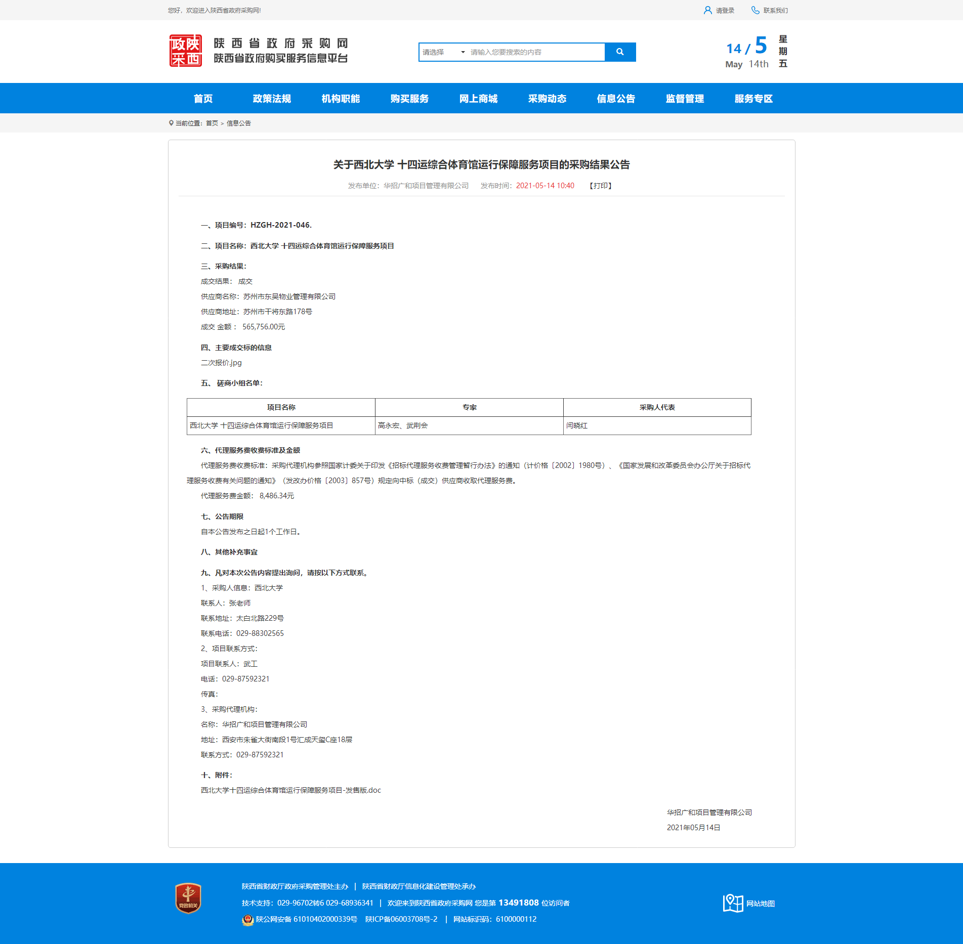 关于乐动网页版登录入口十四运综合体育馆运行保障服务项目的采购结果公告