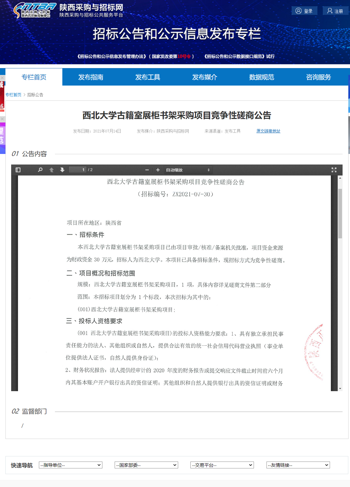乐动网页版登录入口古籍室展柜书架采购项目竞争性磋商公告 作者: 编辑:采购与招标办公室 时间:2021-07-15 原公告地址:http://bulletin.sntba.com/biddingBulletin/2021-07-14/318898.html