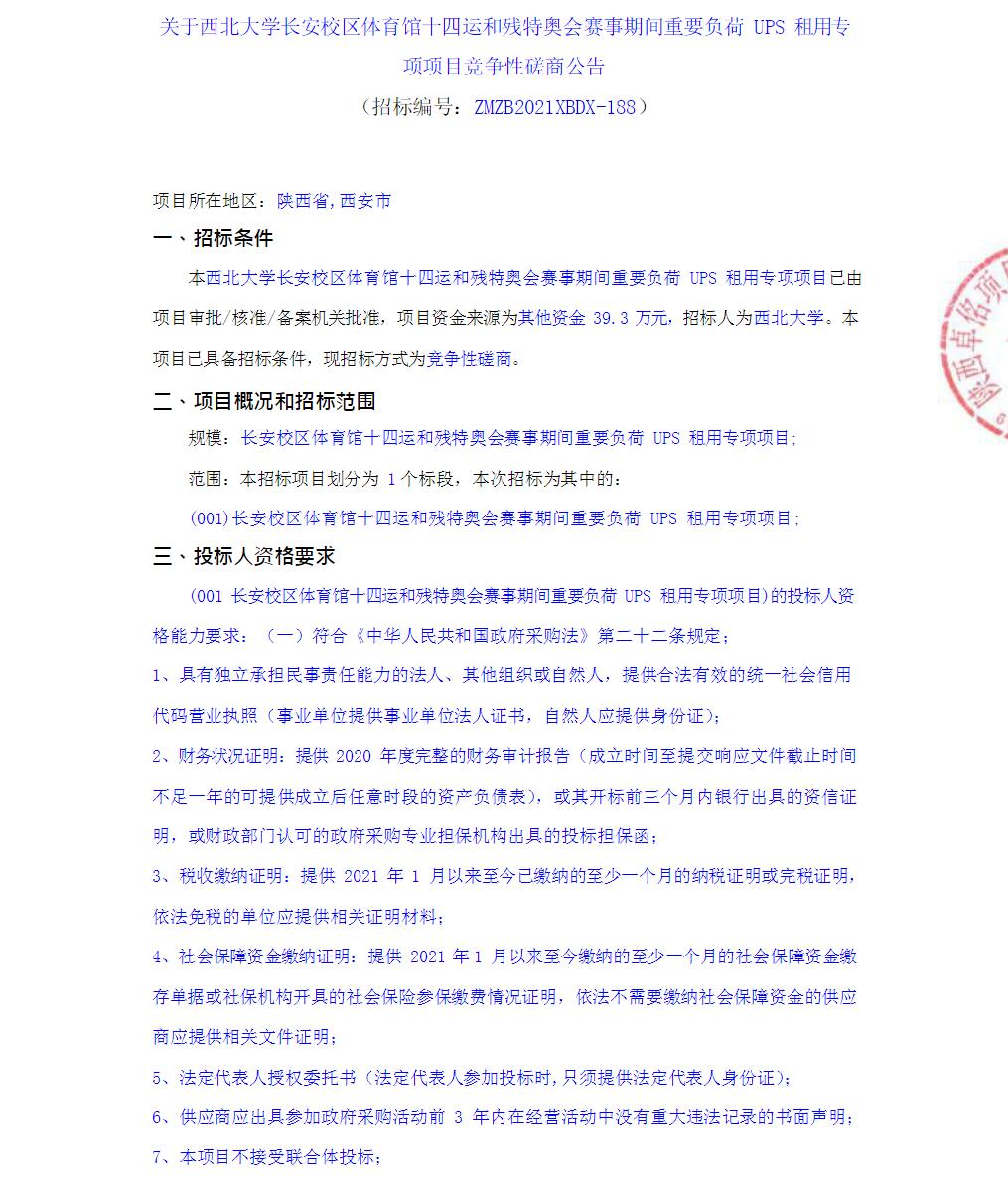 关于乐动网页版登录入口长安校区体育馆十四运和残特奥会赛事期间重要负荷UPS租用专项项目竞争性磋商公告