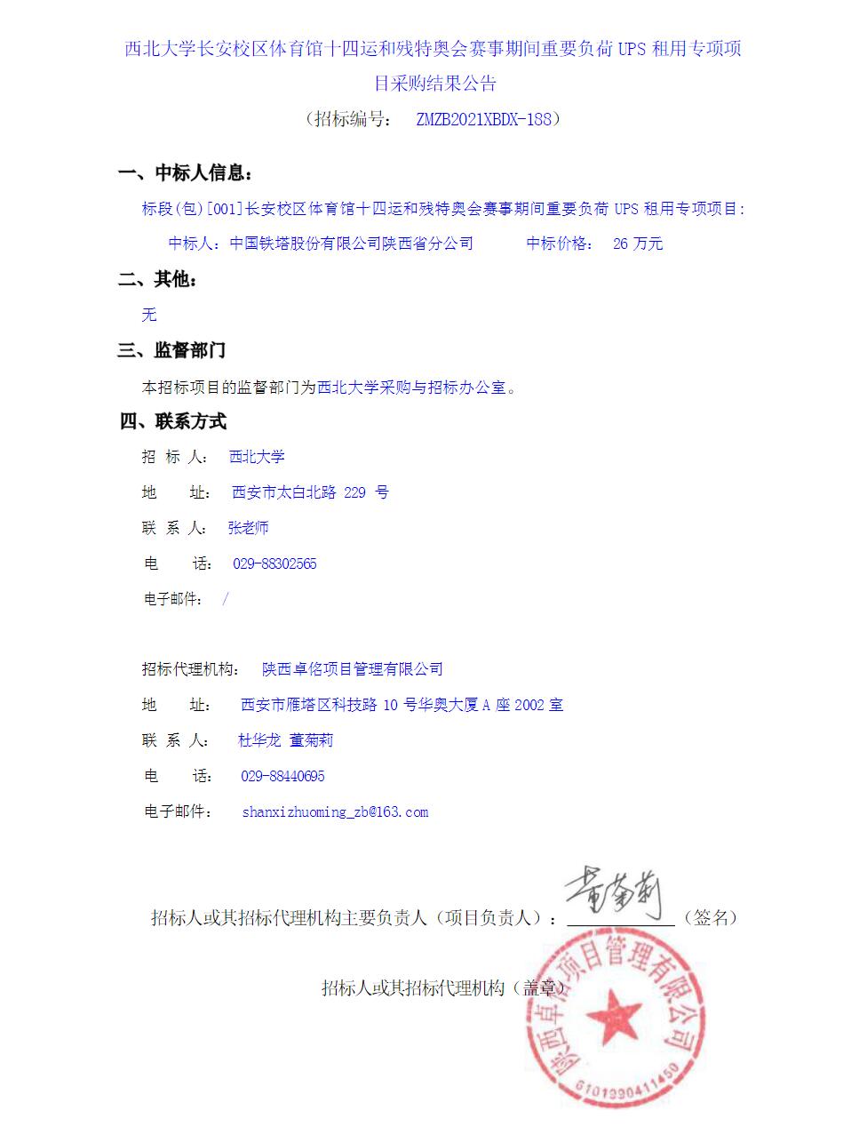 关于乐动网页版登录入口长安校区体育馆十四运和残特奥会赛事期间重要负荷UPS租用专项项目采购结果公告