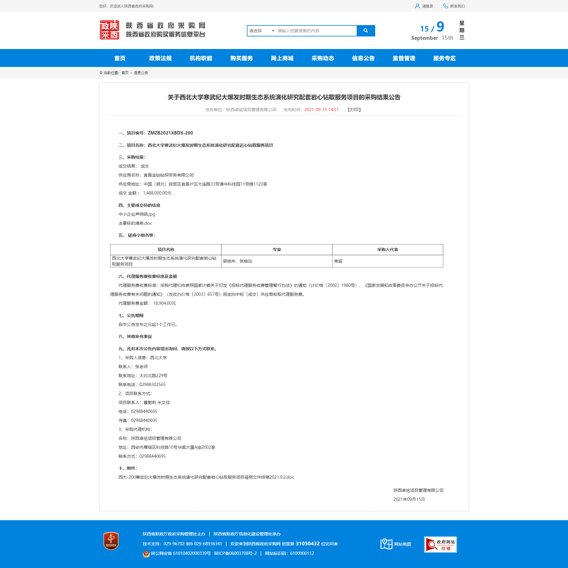 关于乐动网页版登录入口寒武纪大爆发时期生态系统演化研究配套岩心钻取服务项目的采购结果公告