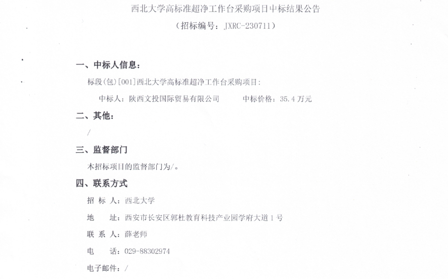 乐动网页版登录入口高标准超净工作台采购项目中标结果公告 作者: 编辑:采购与招标办公室 时间:2023-09-07 原公告链接:http://bulletin.sntba.com/resultBulletin/2023-09-07/651529.html