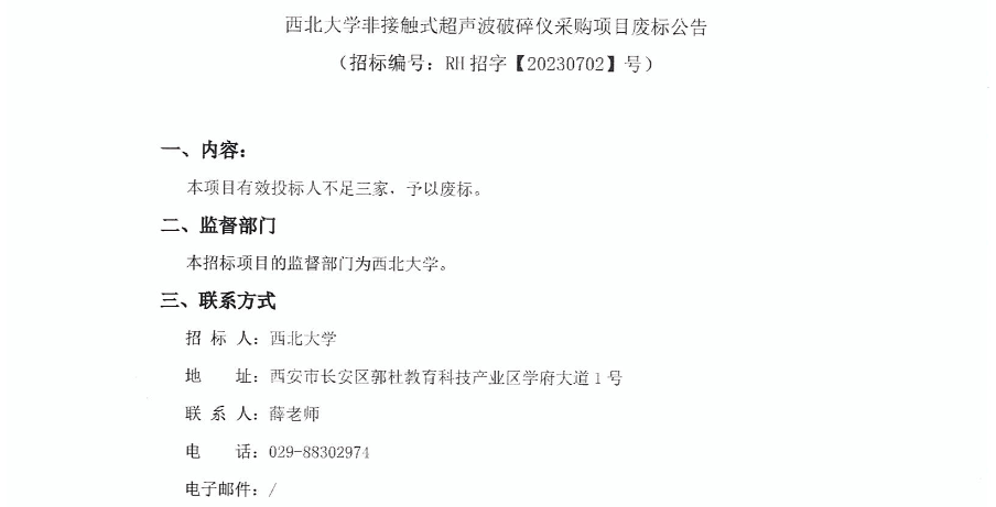 乐动网页版登录入口非接触式超声波破碎仪采购项目废标公告 作者: 编辑:采购与招标办公室 时间:2023-09-07 原公告链接:http://bulletin.sntba.com/changeBulletin/2023-09-07/651428.html