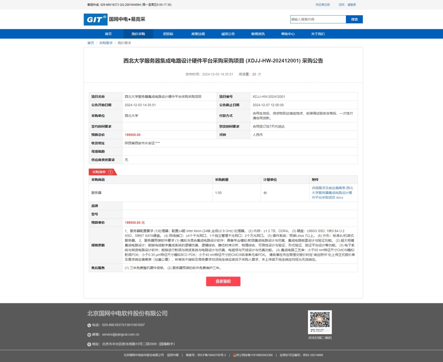 乐动网页版登录入口服务器集成电路设计硬件平台采购采购项目 (XDJJ-HW-202412001) 竞价采购公告 作者: 编辑:薛利娟 时间:2024-12-03 原公告链接:https://www.ejingcai.com.cn/site/bidding/detail/15610