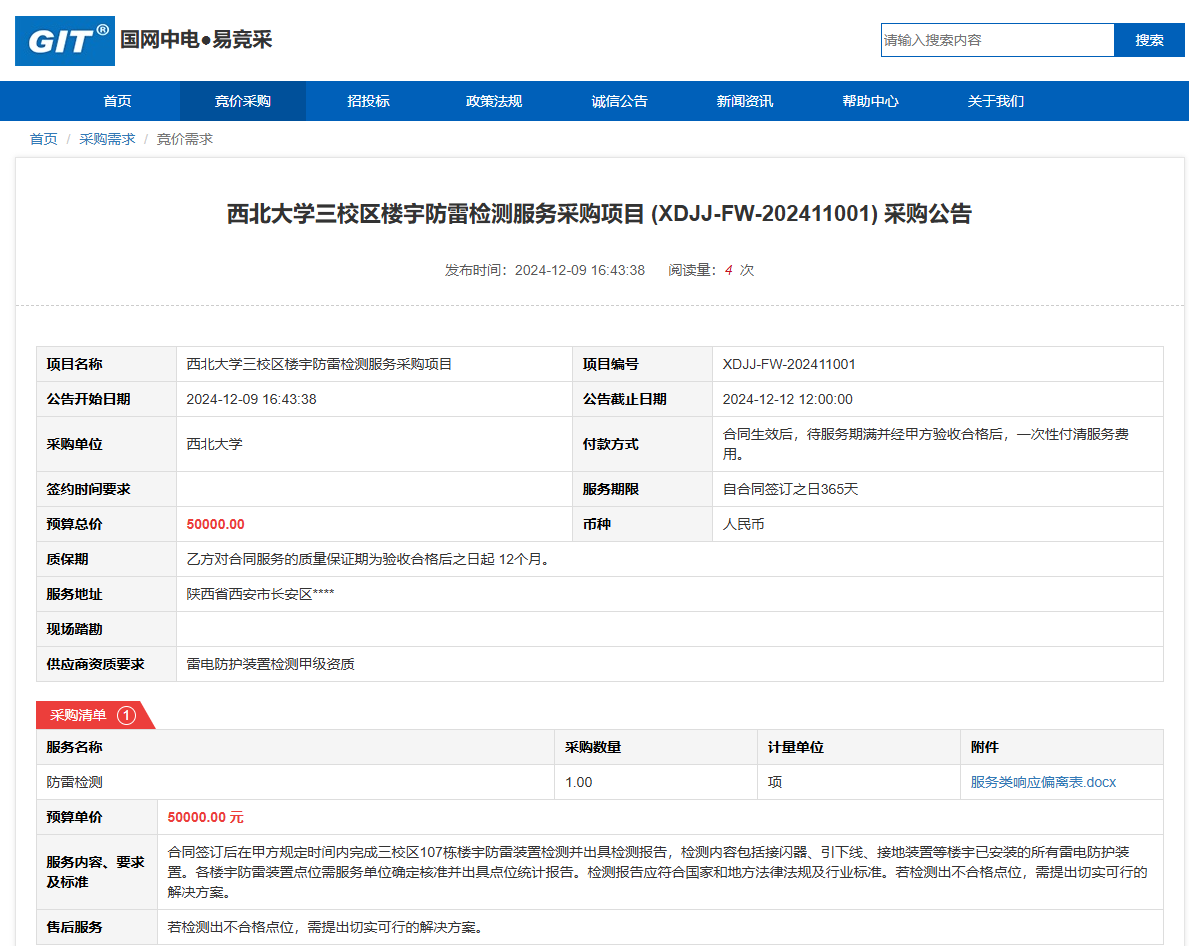 乐动网页版登录入口三校区楼宇防雷检测服务采购项目(XDJJ-FW-202411001)采购公告 作者:采购与招标办公室 编辑: 时间:2024-12-09 原公告链接:https://www.ejingcai.com.cn/site/bidding/detail/15824