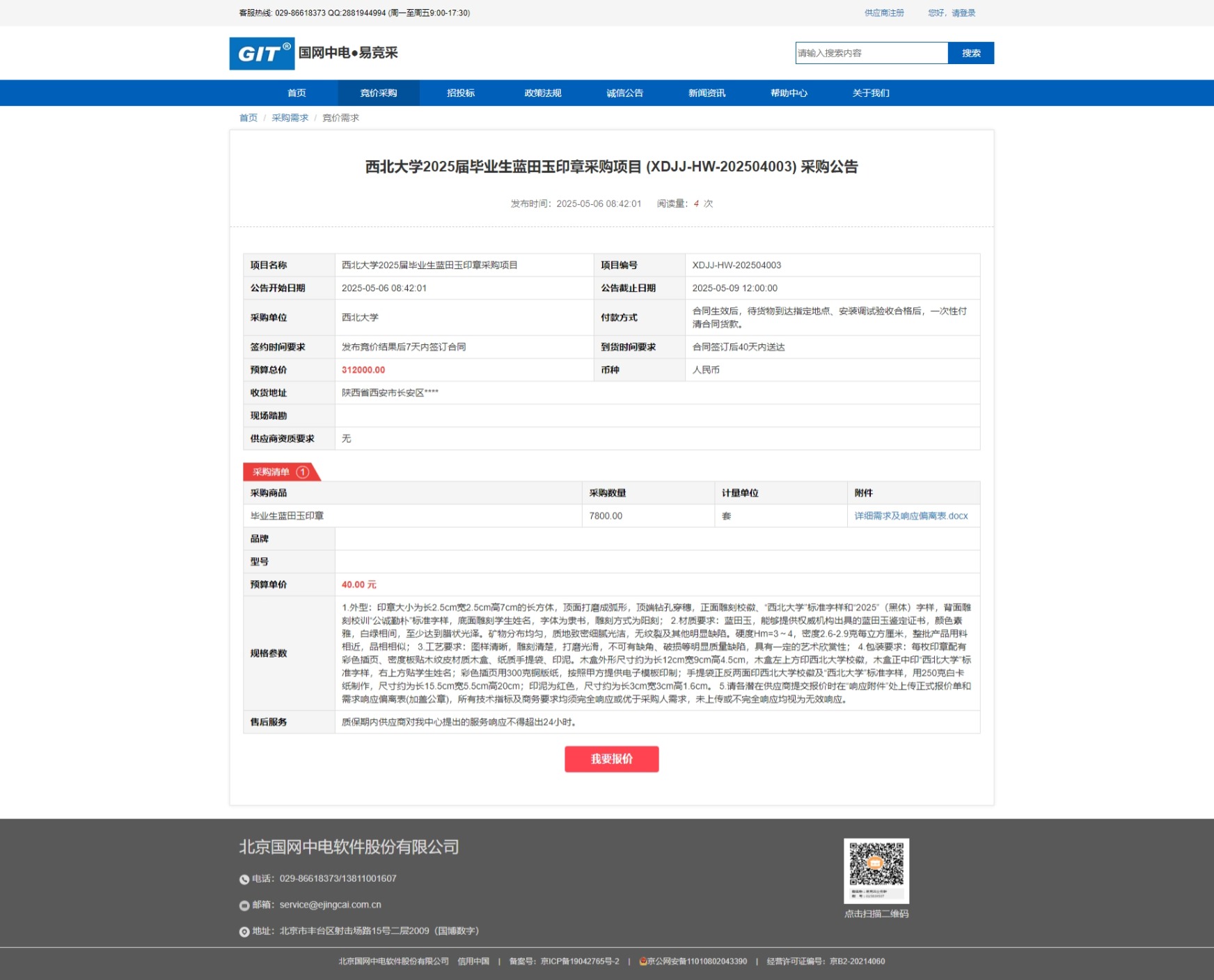 乐动网页版登录入口2025届毕业生蓝田玉印章采购项目 (XDJJ-HW-202504003) 竞价采购公告 作者: 编辑:采购与招标办公室 时间:2025-05-06 原公告链接:https://www.ejingcai.com.cn/site/bidding/detail/18026