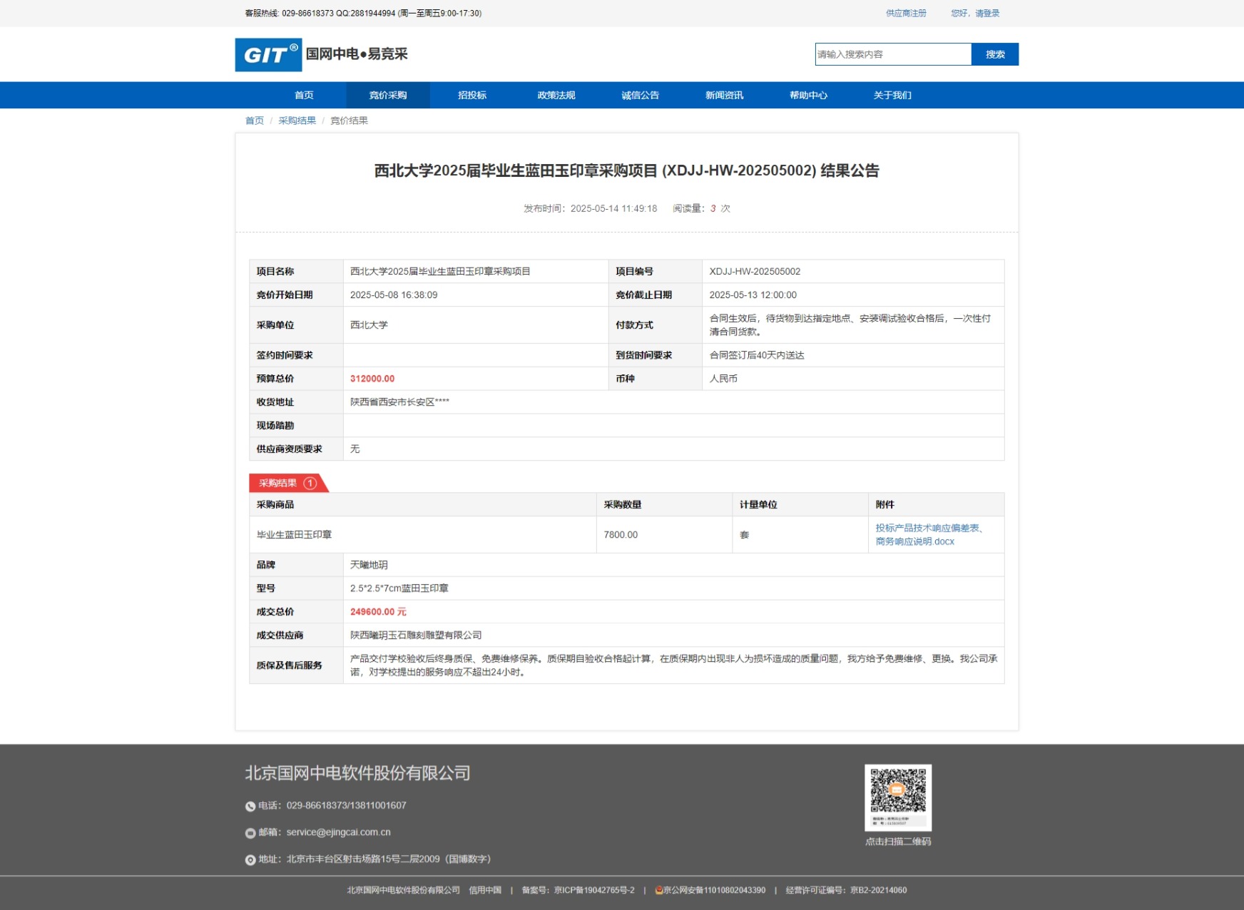 乐动网页版登录入口2025届毕业生蓝田玉印章采购项目 (XDJJ-HW-202505002) 竞价结果公告 作者: 编辑:采购与招标办公室 时间:2025-05-14 原公告链接:https://www.ejingcai.com.cn/site/bidding/detail/18215