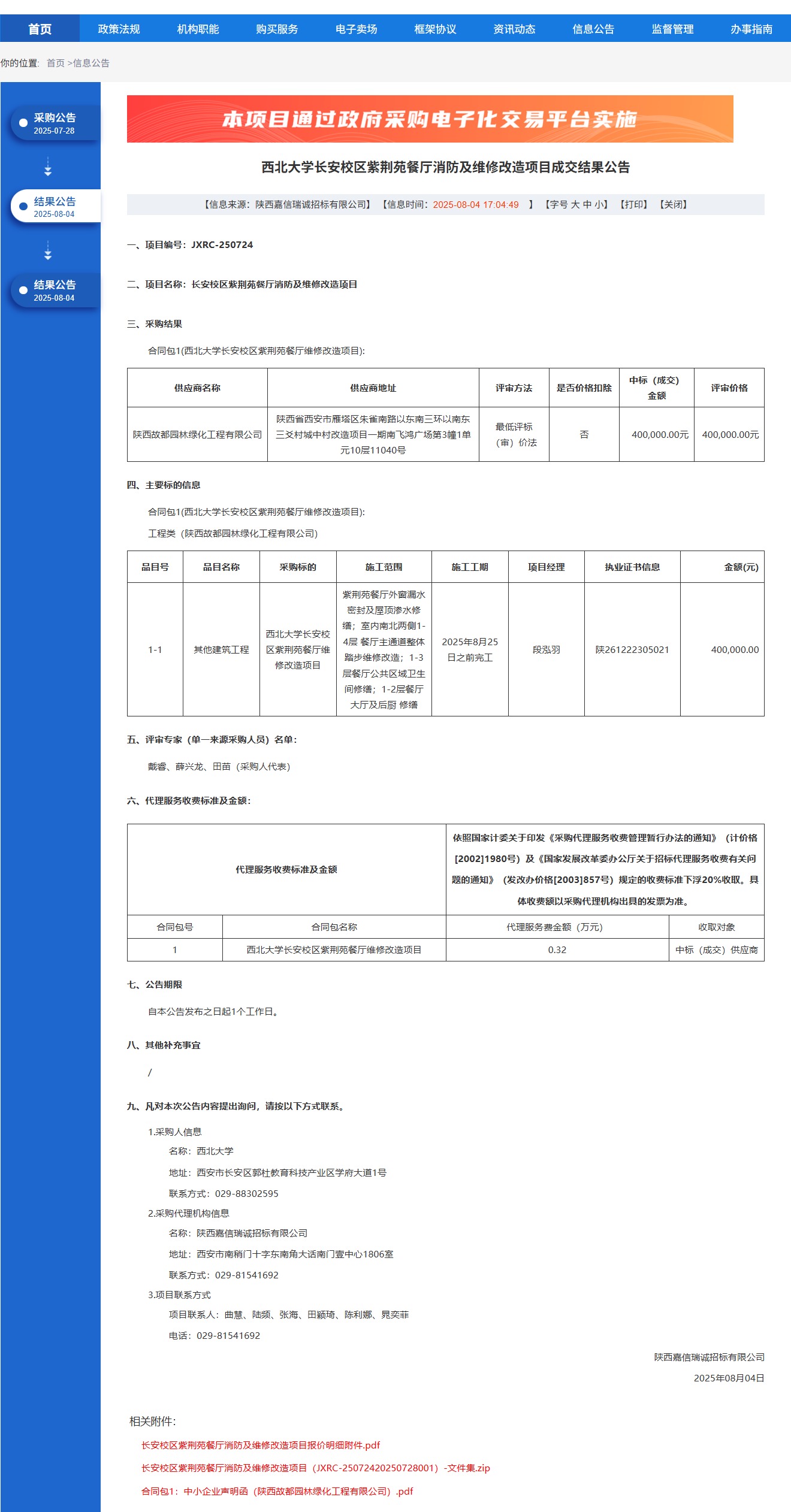 乐动网页版登录入口长安校区紫荆苑餐厅消防及维修改造项目成交结果公告 作者: 编辑:党丹珩 时间:2025-08-04 公告地址:http://www.ccgp-shaanxi.gov.cn/freecms/site/shaanxi/ggxx/info/2025/8a69c4d59860f6420198744983276ed2.html?noticeType=001023¬iceId=1f58d820-7114-11f0-8063-08c0eb20c666
